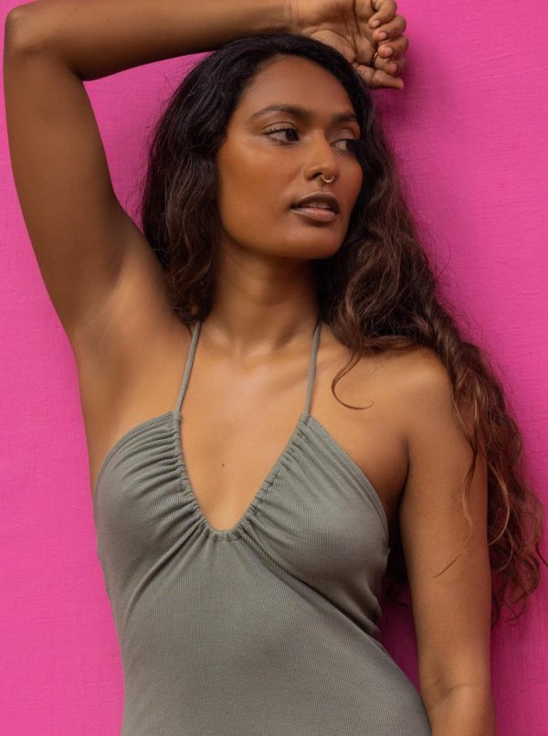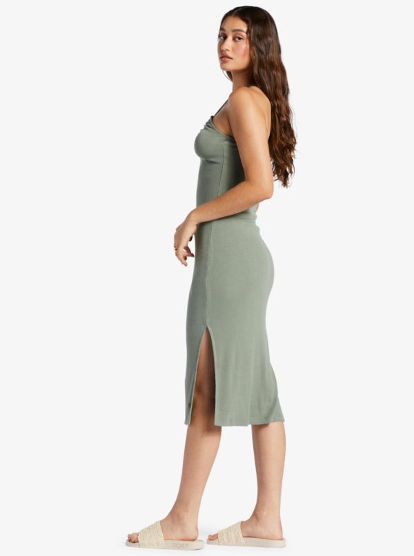 Elevate your summer wardrobe with our ROXY Late Sunset Halter Midi Dress. Crafted from a soft, ribbed knit-blend fabric, it features adjustable halter ties and a deep V-neck with gathers to flatter your shape. A romantic look for your next date night.