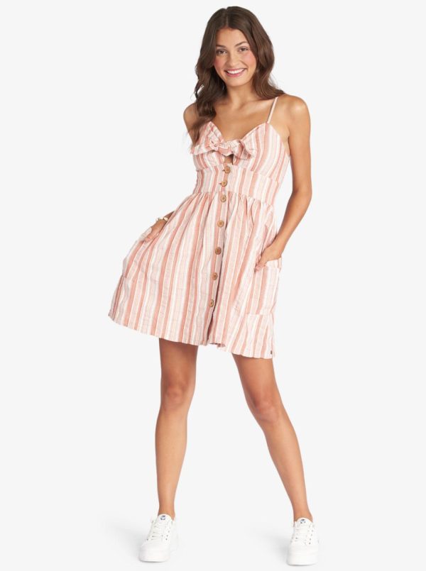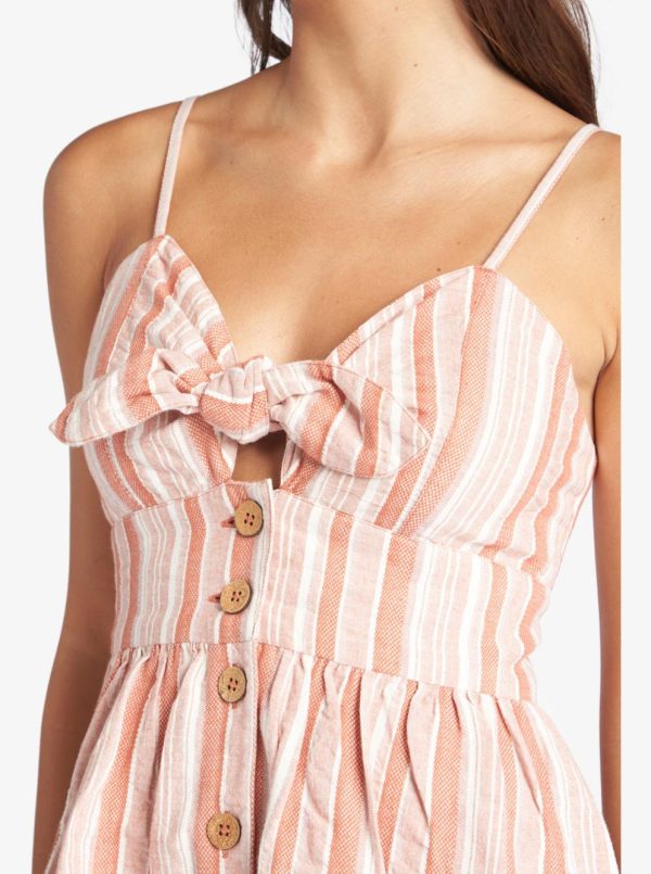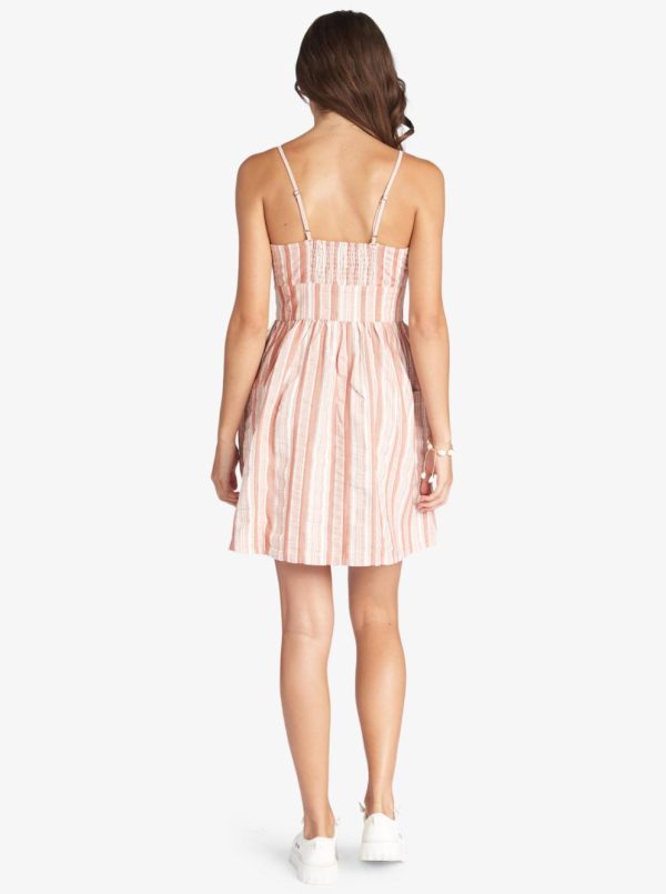 Our Under The Cali Sun design features a summer-ready striped print with shades of tropical peach and ochre yellow. Crafted from yarn-dyed cotton dobby fabric, this strappy dress features a fitted tight waist to accentuate your figure while keeping you comfortable with adjustable stripes and a smocked back panel.