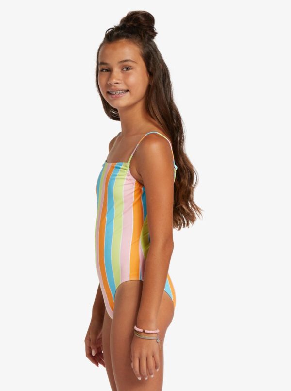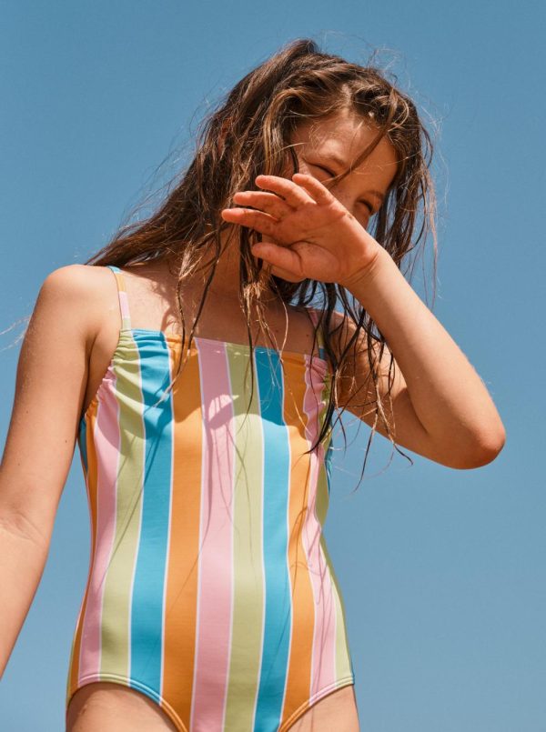 Made of recycled swim fabric, the Last In Paradise striped swimsuit upgrades a classic one-piece with gathering detail at the armhole. Pool-party ready, this girl’s swimsuit offers extra chlorine resistance so you can count on its shape and color to stay true.