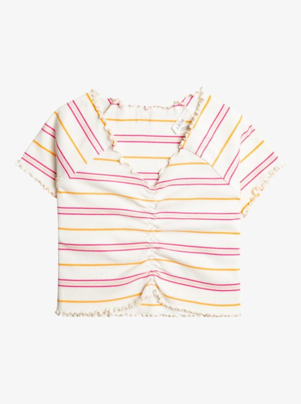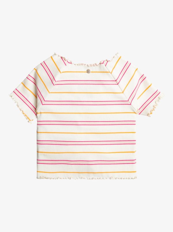 Made of blended rib fabric with yarn-dyed stripes, the Get The Party Started girl’s t-shirt elevates your everyday look with a V-neck, gathers at the center, and lettuce details (aka cute baby ruffles) along the edges.